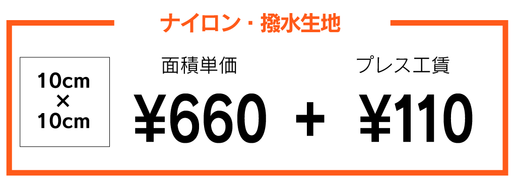 | 1枚 55円(税抜き50円) | 1色1箇所 1,100円(税抜き1,000円) ※色替え最小ロット5枚(ナイロン系は10枚) |